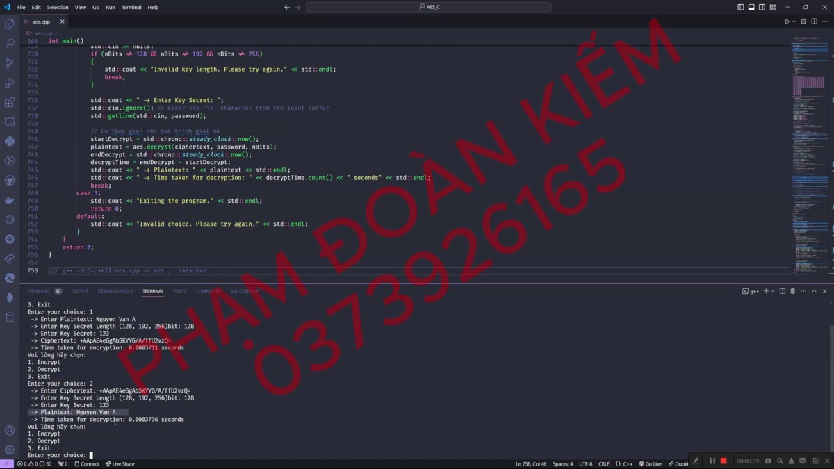Thực hiện mở terminal tại thư mục chứa code và gõ lệnh: g++ -std=c++11 aes.cpp -o aes; .\aes.exe